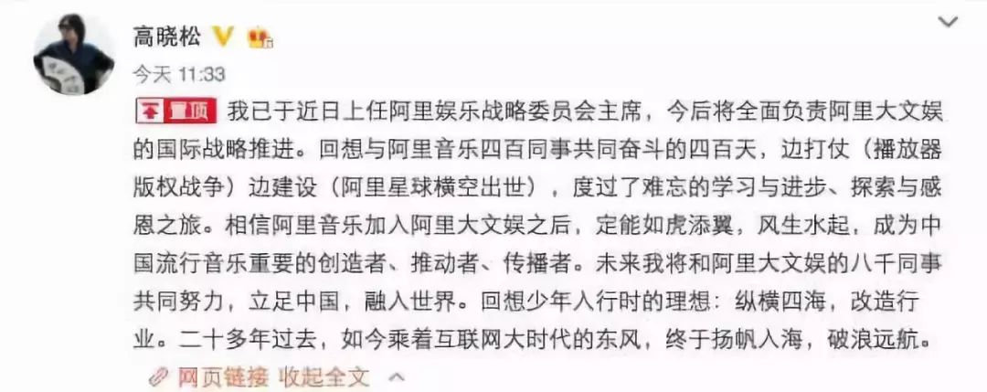 “回想与阿里音乐四百同事共同奋斗的四百天,边打仗(播放器版权战争)边建设(阿里星球横空出世),度过了难忘的学习与进步、探索与感恩之旅……未来我将和阿里大文娱的八千同事共同努力,立足中国,融入世界。回想少年入行时的理想:纵横四海,改造行业。二十多年过去,如今乘着互联网大时代的东风,终于扬帆入海,破浪远航。”