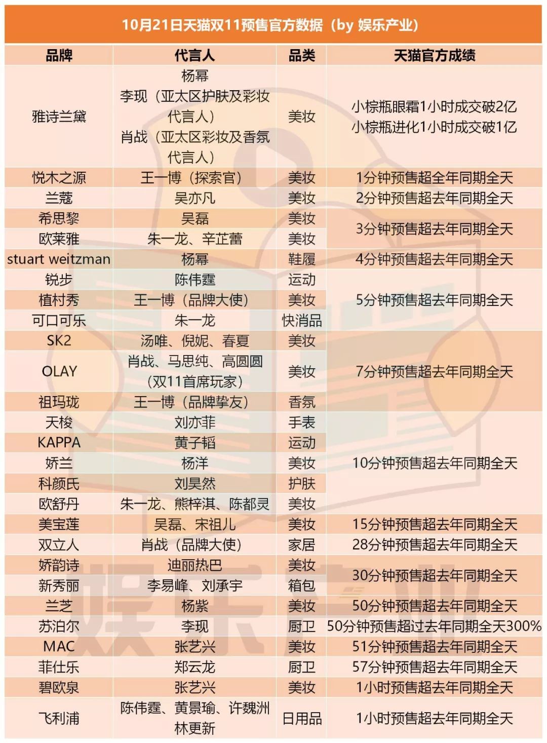 什(谁)么(带)产(的)品(货)最好卖?粉丝说了不算,娱sir给大家列出天猫官方的部分数据,不难看出绝大多数都是美妆,最快突破去年销售纪录的是雅诗兰黛、悦木之源和兰蔻,好巧不巧都在今年官宣了肖战/李现、王一博、吴亦凡作为代言。