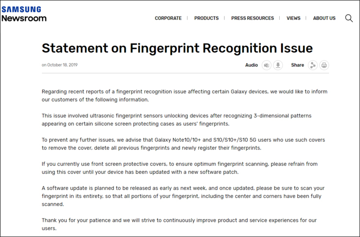 对此,三星电子随后发布官方声明,承认指纹识别程序存在安全漏洞,同时解释称,这并非机器缺陷而是软件问题,可以通过软件更新对此进行完善,同时表示将在下周推出相关修复补丁。
