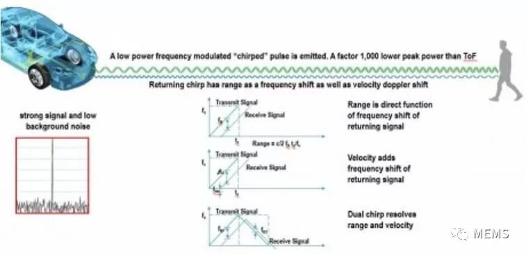 该图说明了FMCW激光雷达的主要工作原理。低功率发射啁啾(绿色)信号到达物体反射,返回啁啾(蓝色)信号之间的频移与物体的距离和速度成比例。向上和向下的啁啾用于解析距离和速度值。