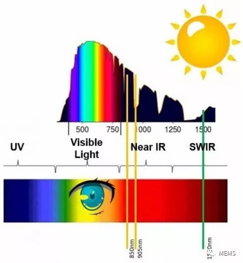 人眼安全问题很重要,它限制了系统的功率和探测范围。此外,在850 nm~905 nm波段有明显的太阳辐射,会在日光下带来干扰。更好的波长选择是1550 nm,其人眼安全性相对高40倍,并且不容易受到日光干扰。