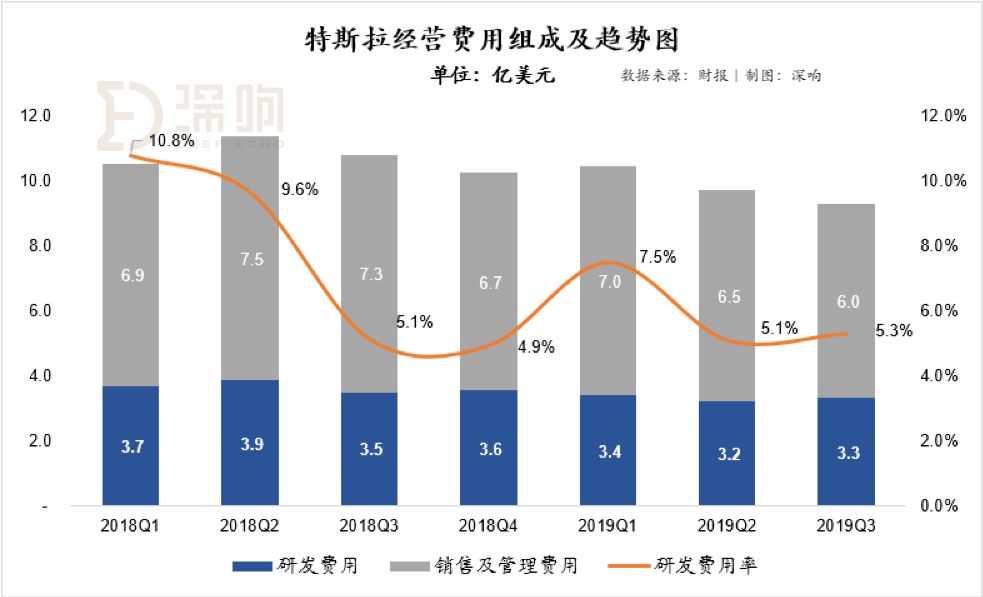 经营费用方面,特斯拉三季度研发费用及销售和管理费用分别为3.3亿美元和6.0亿美元,相比较之前季度呈现稳中有降的趋势;其中研发费用率本季度为5.3%,较为稳定。