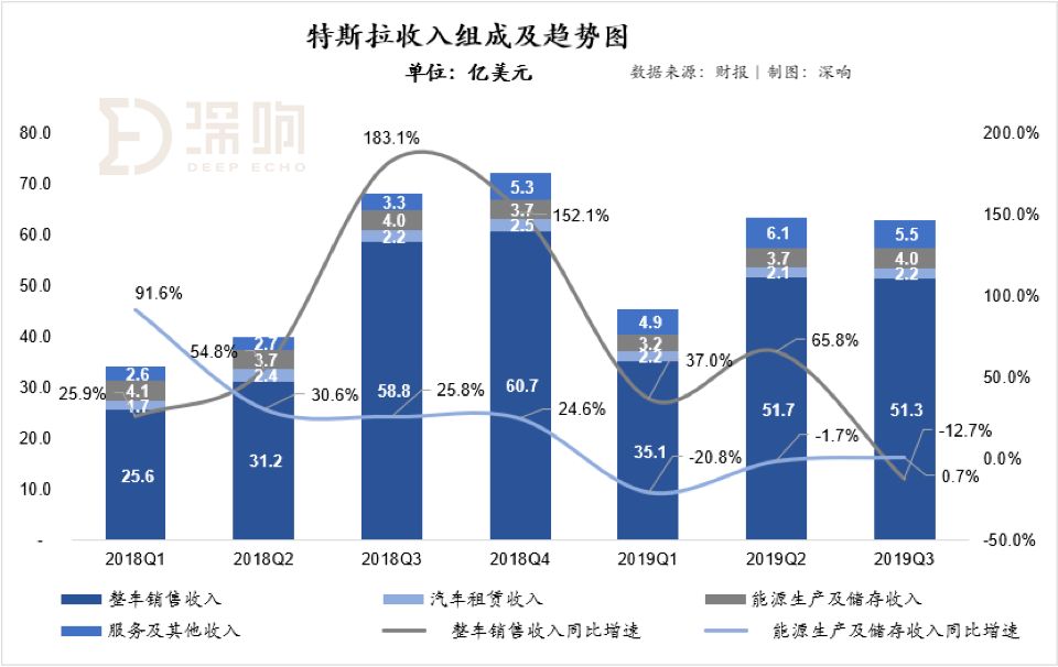财报显示,特斯拉三季度营收63亿美元,相比较去年同期的68.2亿美元同比下降7.6%,这主要是由于整车销售收入同比大幅下降导致。在整车销售方面,特斯拉本季度实现整车销售收入51.3亿元,相比较18年三季度下降12.7%。值得注意的是,无论是总营业收入还是在整车销售收入方面,特斯拉均首次出现同比下降趋势。