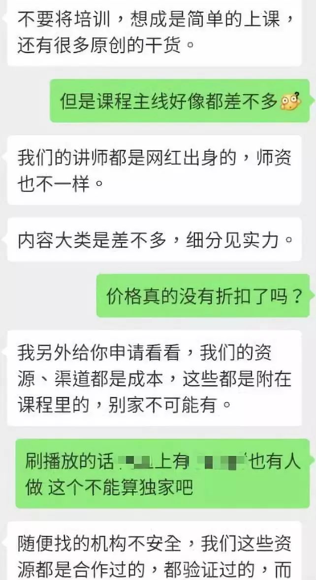 在发送一些网上随机收集的资料给对方之后,对方表示有些为难。本以为,这样就能够难倒客服,让其知难而退。没想到,客服依然表示可以报名参与网红培训学习,“实话实说,您当网红可能有些难度,但是理论知识完全可以用于其它的方面。”