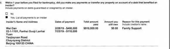 即使背负巨额债务,远在美国,贾跃亭也没有忘记照顾家庭。破产申请文件显示,他分别于今年2月28日和7月23日支付给甘薇40万美元和11万美元(总共折合361万人民币)作为家庭生活费用。