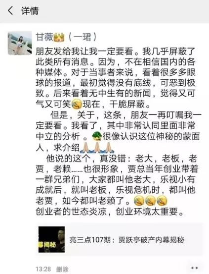 与李国庆夫妇的腥风血雨不同,这场离婚来得悄无声息:双方始终保持沉默,甘薇只转发了一篇关于贾跃亭的文章,字句间还透着疼惜。