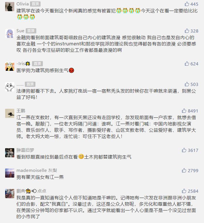但随着热度上升,质疑声也不断涌现。昨日,自媒体“小声比比”推送了一篇名为《江一燕喜提建筑大师奖,讽刺了200万建筑人的辛酸》的文章,阅读量瞬间达到10万+,再翻看底下热评,几乎全部是质疑声和批评声,甚至有人把江一燕比作女版翟天临。