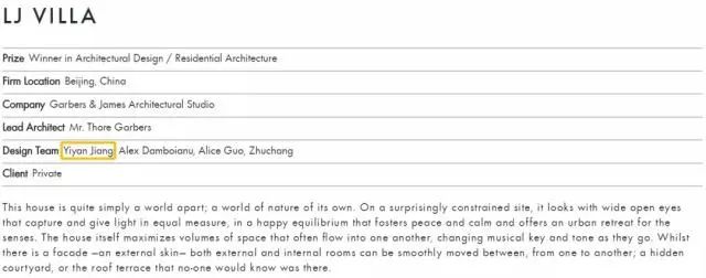 在目前曝光的一个视频中,江一燕称此次获奖的作品系其私人住宅,该住宅于2017年完工,前后进行6年,更换五任设计师,最后找到了德国人ThoreGarbers。江一燕谈到,主持设计的德国设计师与自己想法高度契合,最终呈现的也主要是“我和他一起的想法”。