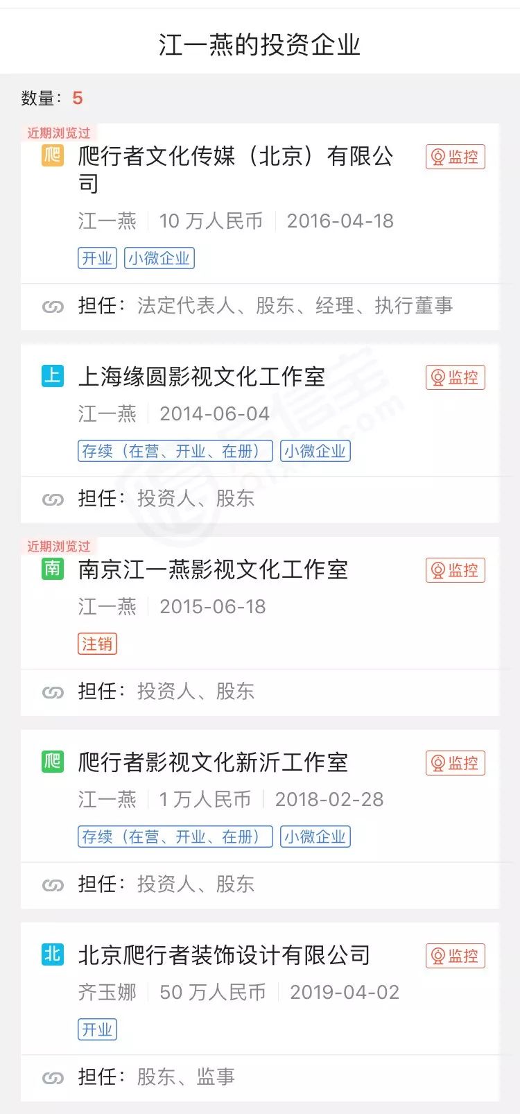 演员、歌手、摄影师、支教老师……这些都是江一燕在观众面前极力塑造或充分展示的。此外,她也是一位明星投资人,启信宝显示,目前江一燕投资的企业共5家,包括4家文化传媒公司、1家装饰设计公司。