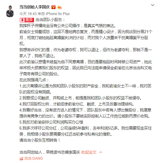 36氪获悉,针对俞渝的爆料,当当网创始人李国庆昨日晚间发布15则针对性回应,称“只有一件是真的,其他都假的。”李国庆表示,“俞渝此次污蔑我把我说成人渣完全是精心策划的,就是为了离婚中不平分股权,而且完全突破我和俞渝约定的只谈工作纷争的底限。既然俞渝说了私生活,那我就逐一回应。”李国庆还称,“念家庭旧情,就不再爆俞渝黑料了。”