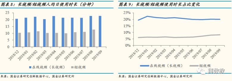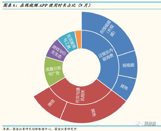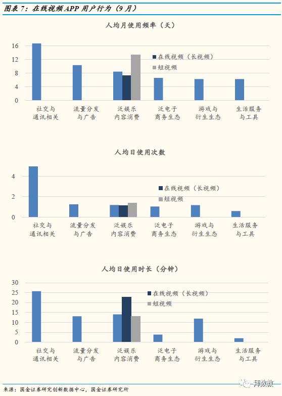 在线视频仍然是除社交以外的最大流量入口。短视频和长视频(在线视频)具有完全不同的应用场景,短视频具有高频次、碎片化使用的特点;而在线视频使用频次较短视频低,但使用时长远高于短视频。以此来看,在线视频应用对内容质量的要求更高,而短视频则相对低许多。自年初以来,短视频人均使用时长增长20%,增势显著。