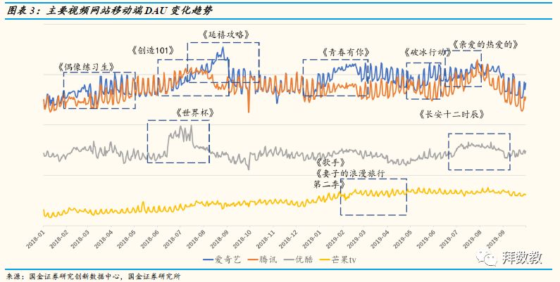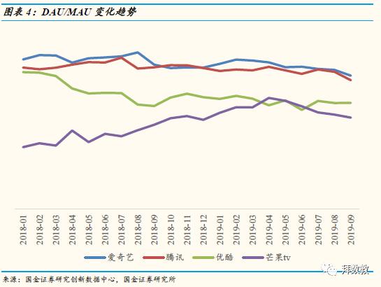 受内容及节目排期影响,各平台DAU均有所下滑。相较于MAU,DAU的变化更加显著,它反映的是在线视频深度用户的使用情况,在缺乏优质内容的9月,各平台的DAU均有显著下滑。今年上半年以来,爱奇艺的月平均DAU始终保持领先,腾讯视频、优酷、芒果tv分列其后,芒果tv月均DAU同比增长近50%,表现优异。