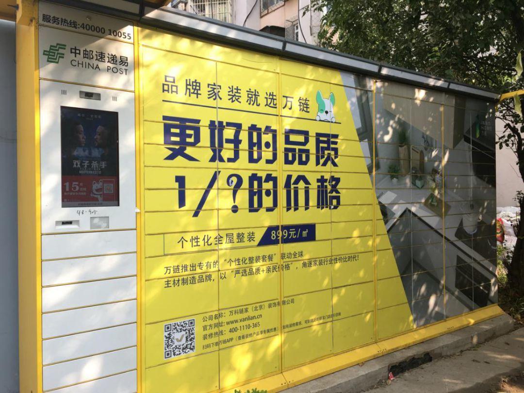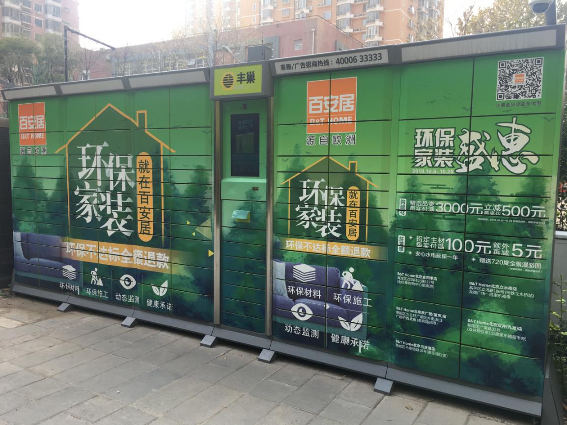 同时,丰巢也涉足广告业务,有的丰巢智能柜机身有一些品牌广告,例如百安居、万链(万科与链家合作的装饰公司)等,有的正处于“招商中”。在显示屏上,也会有一些平面广告和视频广告。