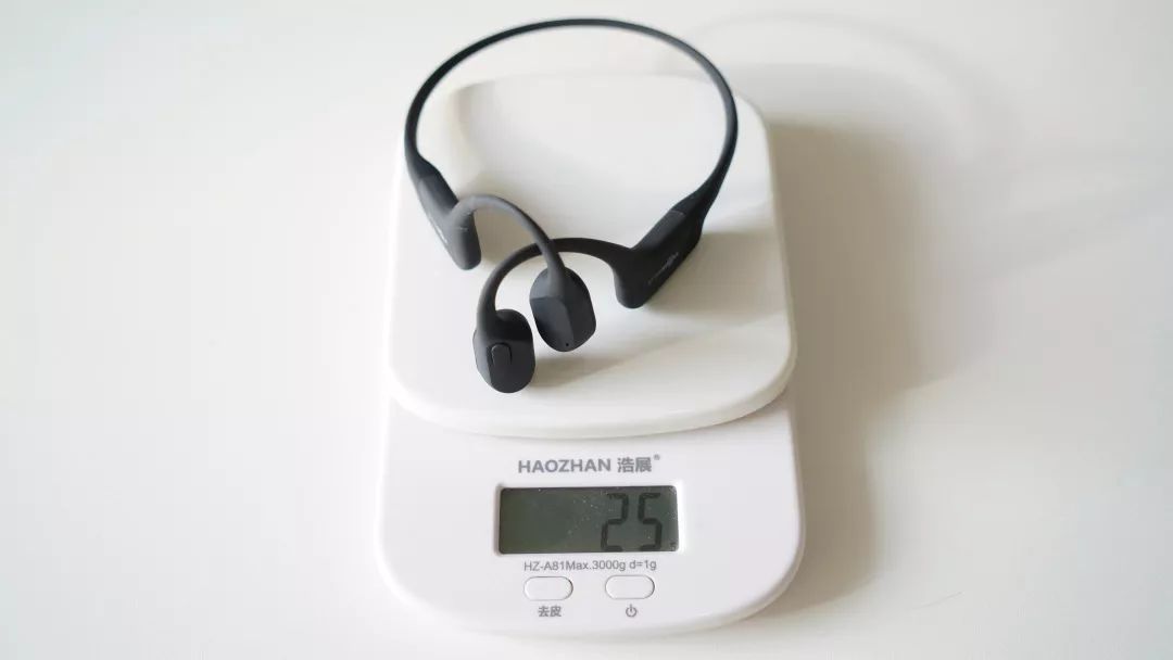 上秤一称,重量只有25g左右。要知道,两只AirPods耳机的重量是8g左右,而韶音Aeropex差不多只等于3对AirPods的重量,完全可以称得上轻盈了。
