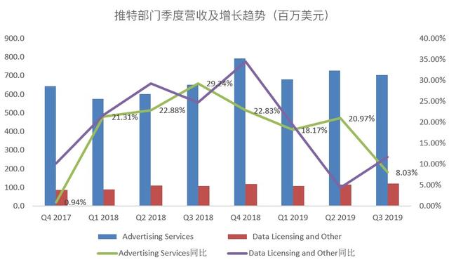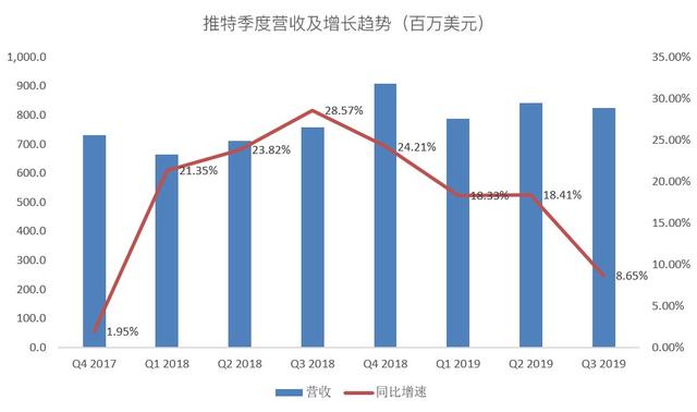推特公司自己解释提到许多“不利因素”,其中包括产品问题以及7月和8月的广告量低于预期。众所周知,推特营收靠广告,广告业务的营收趋势走向和总营收增长趋势高度吻合。