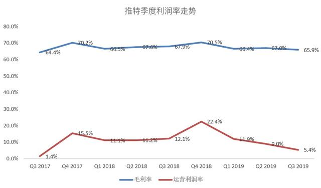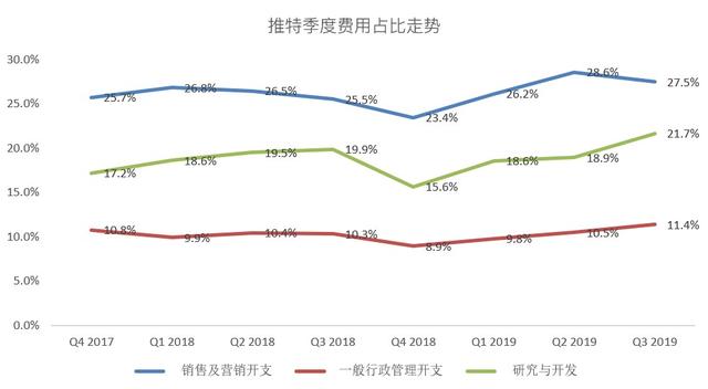 从利润率情形来看,毛利率略有下滑,运营利润率来到近两年低点。而正是两年前那次Q3季报,让推特股价再次起飞。深究本季度推特各项费用占比表现,可以看到研发费用连续四个季度上升。