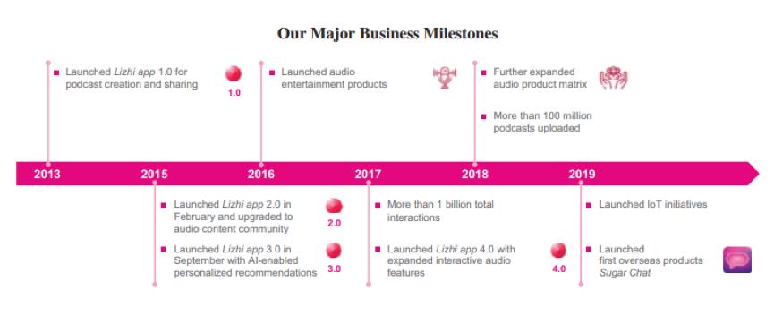 招股书披露了荔枝的发展历程:荔枝上线于2013年,当时还叫做“荔枝FM”,并提出“人人都是主播”的口号,每个用户都可以创造音频内容并分享;2015年加入AI个性化推荐;2016年上线语音直播;2017年用户互动次数超过10亿次;2018年累计产生原创音频节目超过1亿期;2019年正式布局海外和IoT场景。
