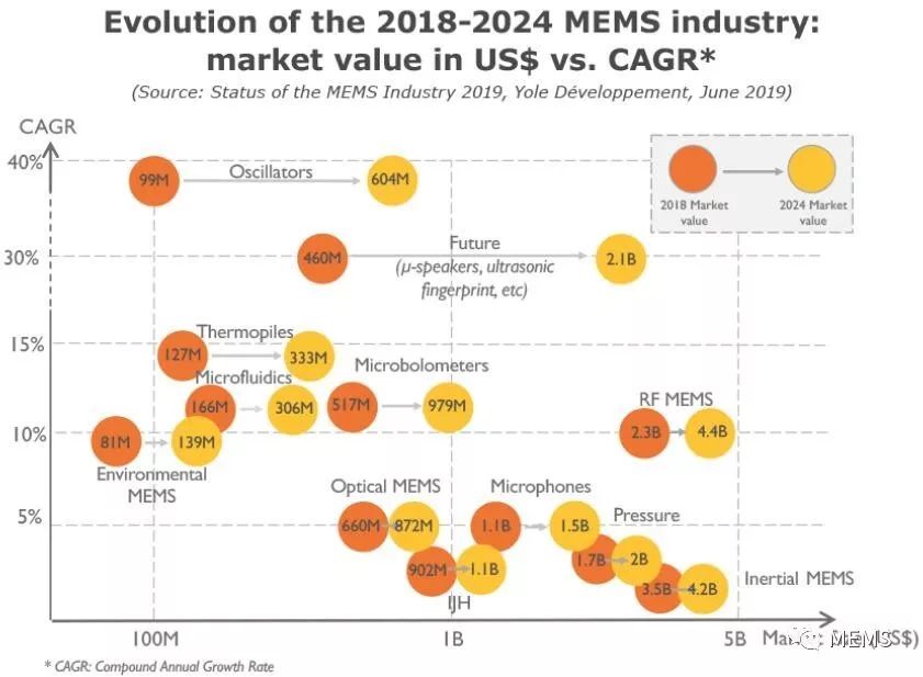 2018~2024年MEMS产业演进:各种MEMS产品市场趋势(资料来源:《MEMS产业现状-2019版》)