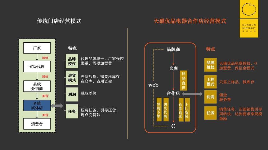 比如天猫优品电器合作店的运营,它实际是由厂商直发,授权品牌到你的店,中间没有省级代理,没有县级代理,也没有乡镇代理,直接到消费终端的门店口。这里面有一个品牌授权,之间不存在直接上下游的控制关系,他们上传样品就行了,所以库存很低,而且不是赚取差价。