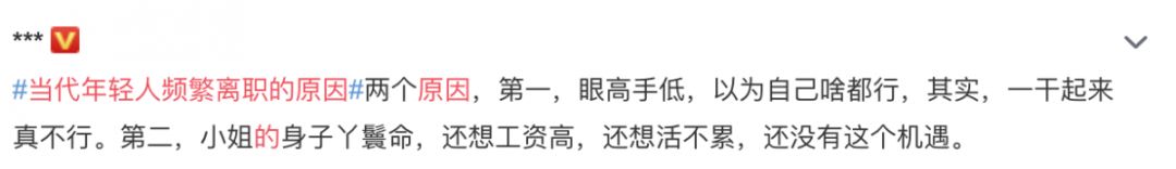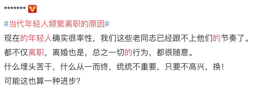 不久前,话题“当代年轻人频繁离职的原因”便曾登上微博的热搜榜,一时间打开了大家的话匣子。该话题从年轻人角度看,更像是一种陈述和辩解,从用人单位或者上一代人的角度看,就更像是一种吐槽和无奈。上一代是怎么看的呢?我们从以下条加V用户的留言中可见一斑:
