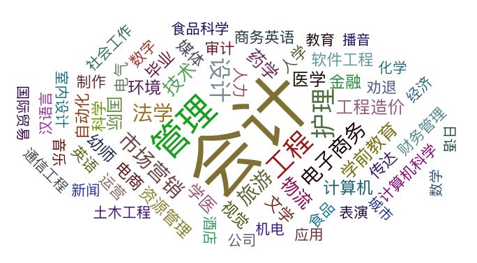 会计专业以最大号字体一枝独秀,旁边跟着管理、工程、护理、市场营销、电子商务等相关专业。看来会计相关的工作,是目前大家认为最辛苦的一个工作,大家好好关爱身边学会计、做会计的亲人朋友们吧。