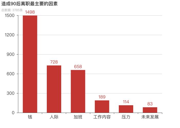 钱是最主要的因素。在3785条关于离职原因的留言中,有1498条留言都跟“钱”有关,占了总数的39.6%。其次比较显著的是人际关系和加班,分别占了19.2%和17.4%。工作内容、压力、未来发展这些因素所占的比重较小。说明年轻人辞职,钱少事多、人情难处是关键,而并不是抗压能力差。