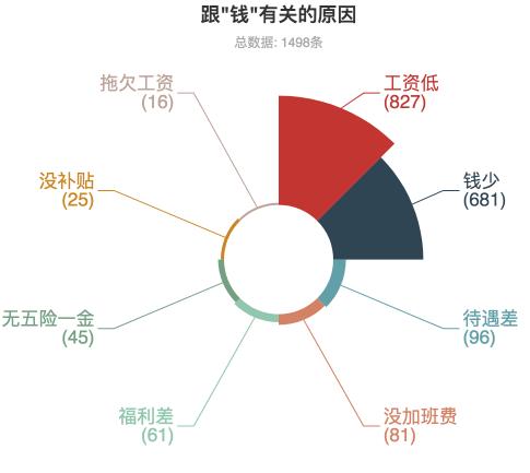 跟“钱”有关的1498条留言中,有一些关键词被反复提及,比如“工资低”、“钱少”、“待遇差”等,其中工资低”和“钱少”被提及得最多,另外还有很多人反应福利差、没有五险一金、没加班费没补贴、甚至有些单位还存在拖欠工资的情况。