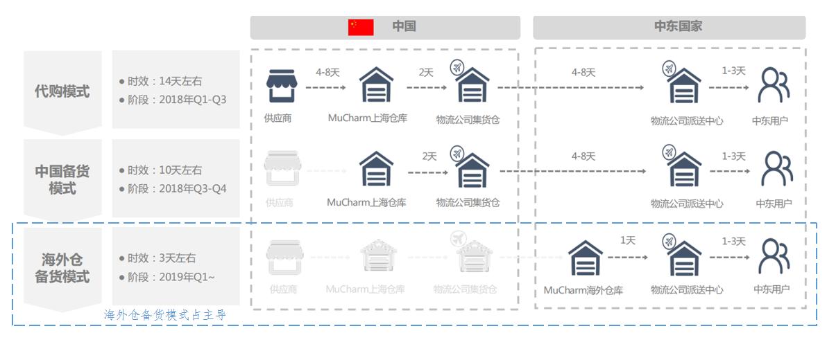 在物流网络层面,MuCharm所采用的是1个总仓+1个区域仓的模式。位于沙特的区域仓覆盖中东6国,主要存储已被当地市场反复验证的爆款产品;国内总仓则主要向区域仓补货,并用于存储新品等市场需求尚不明朗的产品。这样的二级库存设置,主要作用是在加快配送速度的同时最小化中国与沙特之间不必要的物流费用损耗。