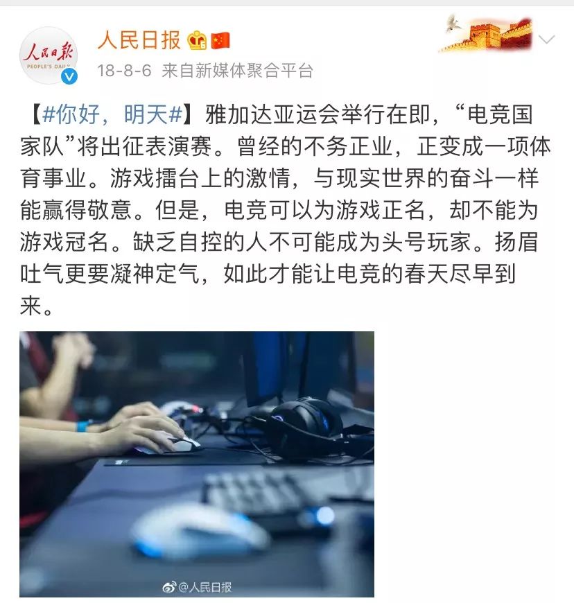 而2018年中国队夺得亚运会LOL冠军、IG夺得S8冠军,不仅让更多非核心受众接触到LOL比赛,同时也借《人民日报》等官媒的喝彩,进一步给电竞正了名。
