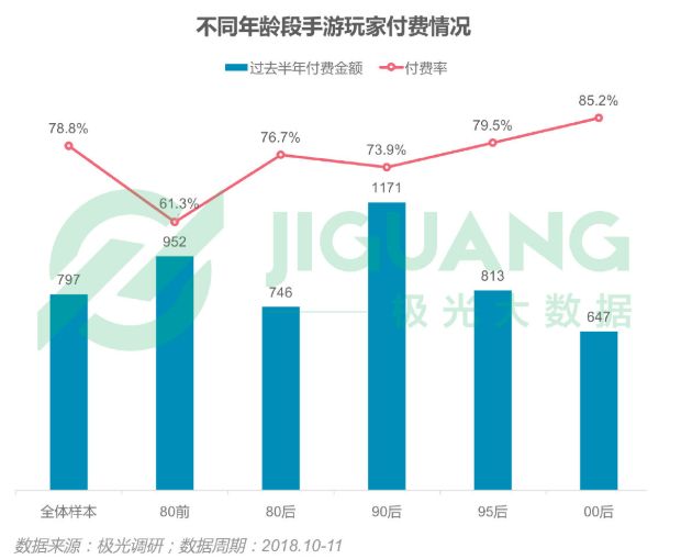 从极光大数据发布的行业调查数据来看,00后和95后在手游端已经展现出了极高的付费热情,有付费意愿的用户占比纷纷达到了80%左右。