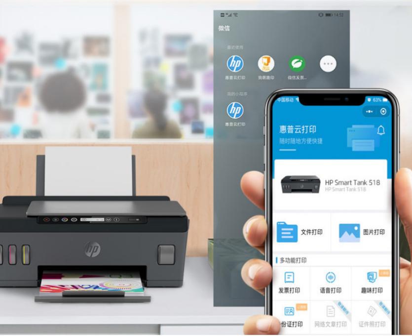 而518连供无线打印一体机则实现了微信直连远程打印,不需要下载APP,通过微信小程序安装,一人绑定,多人分享,让你不再受空间限制,真正享受到便捷的移动办公。