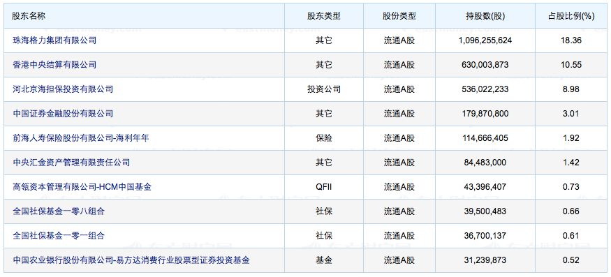 格力电器股东构成(截至2019年6月30日,截图来源:东方财富网)
