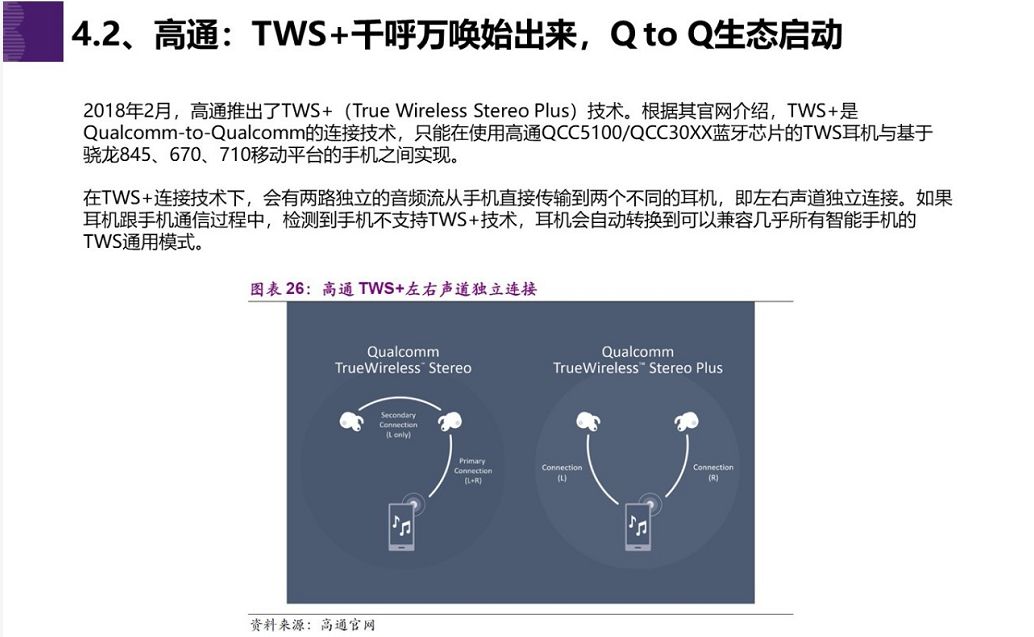 光大证券分析师表示,连接性能一直是TWS的核心痛点,而早期其他品牌厂商TWS的用户对其连接性能评价较差,原因在于苹果专利封锁了监听模式双耳连接方案,而其他TWS耳机主要通过通过一个耳机接收蓝牙信号,然后再唤醒另一只耳机,信息传递时间增加,响应速度较慢。