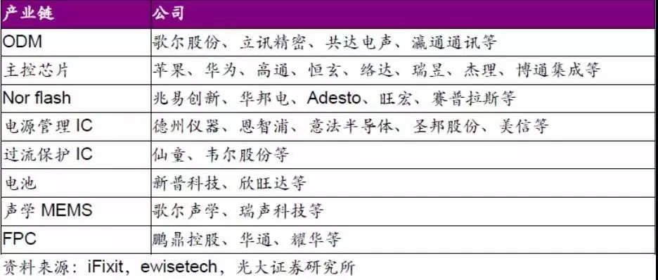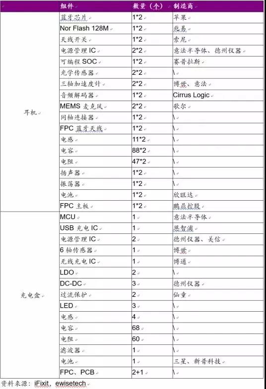 零组件包括主控芯片、存储芯片、电源管IC、MEMS、音频解码器、过流保护IC、电池、FPC等。