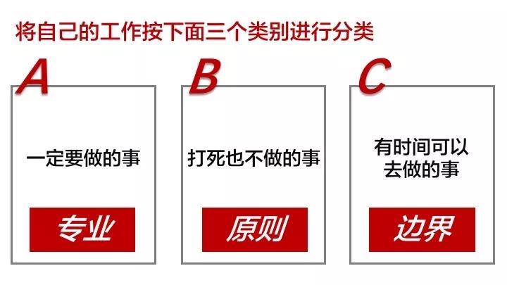 他让我把“给客户做workshop准备”摆在A表,“协助撰写产品方案”放在B表,“做资料整理”放在C表。并告诉我打死也不做的意思,是你有能力做,但没时间做也不应该去做。