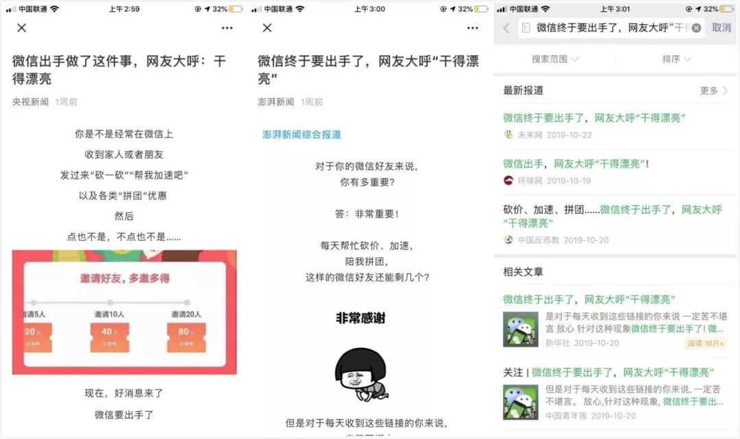 同时在微信上搜了一下,发现央视新闻、新华网、澎湃新闻、各地电视台等公众号都纷纷推文:微信封禁砍价拼团,网友大呼“干得漂亮”。微博和微信上的普通用户评论全是“双手支持”、“早就不堪其扰”等。