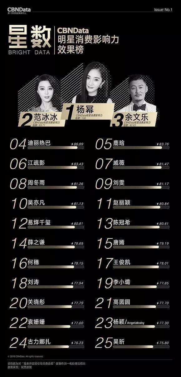根据CBNData数据显示,明星们的带货能力排名前三甲的为范冰冰、余文乐和杨幂,其中杨幂排名第一。除此之外,迪丽热巴、江疏影、吴亦凡、周冬雨、薛之谦、易烊千玺等明星也在榜单之中,不同品牌领域的明星带货能力也皆为不同。