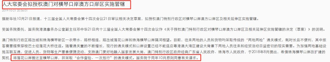 包括这一次的拟授权澳门直接将莲花口岸搬迁至横琴口岸,并采取“合作查验、一次放行”的通关模式