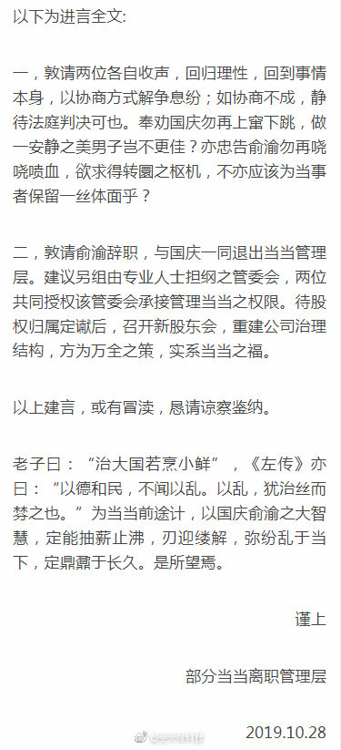 10月28日,署名为“当当离职高管层”的人通过匿名信表示,希望李国庆和俞渝各自收声,回归理性,回到事情本身,以协商方式解争息纷。简单来说,就是夫妻互撕这场大戏已经看厌了。