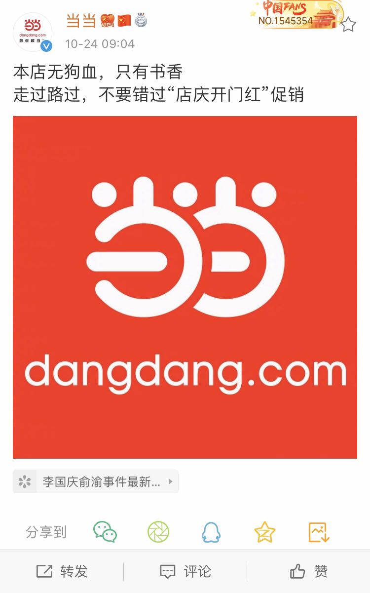 父母打架,儿子也没闲着。当当显然也没有放过这波机会,就在李国庆、俞渝在微博上掐得头破血流之际,当当悄悄更新了一条微博,“本店无狗血,只有书香。走过路过,不要错过“店庆开门红”促销 ”,不忘做起生意。