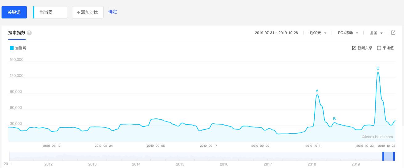 百度指数显示,最近90天里,当当的搜索指数在10月24日,也就是李国庆夫妇开撕的当天,达到了顶峰,为130075。两周之前,李国庆通过摔杯子,也摔出了87989的搜索指数小高峰。