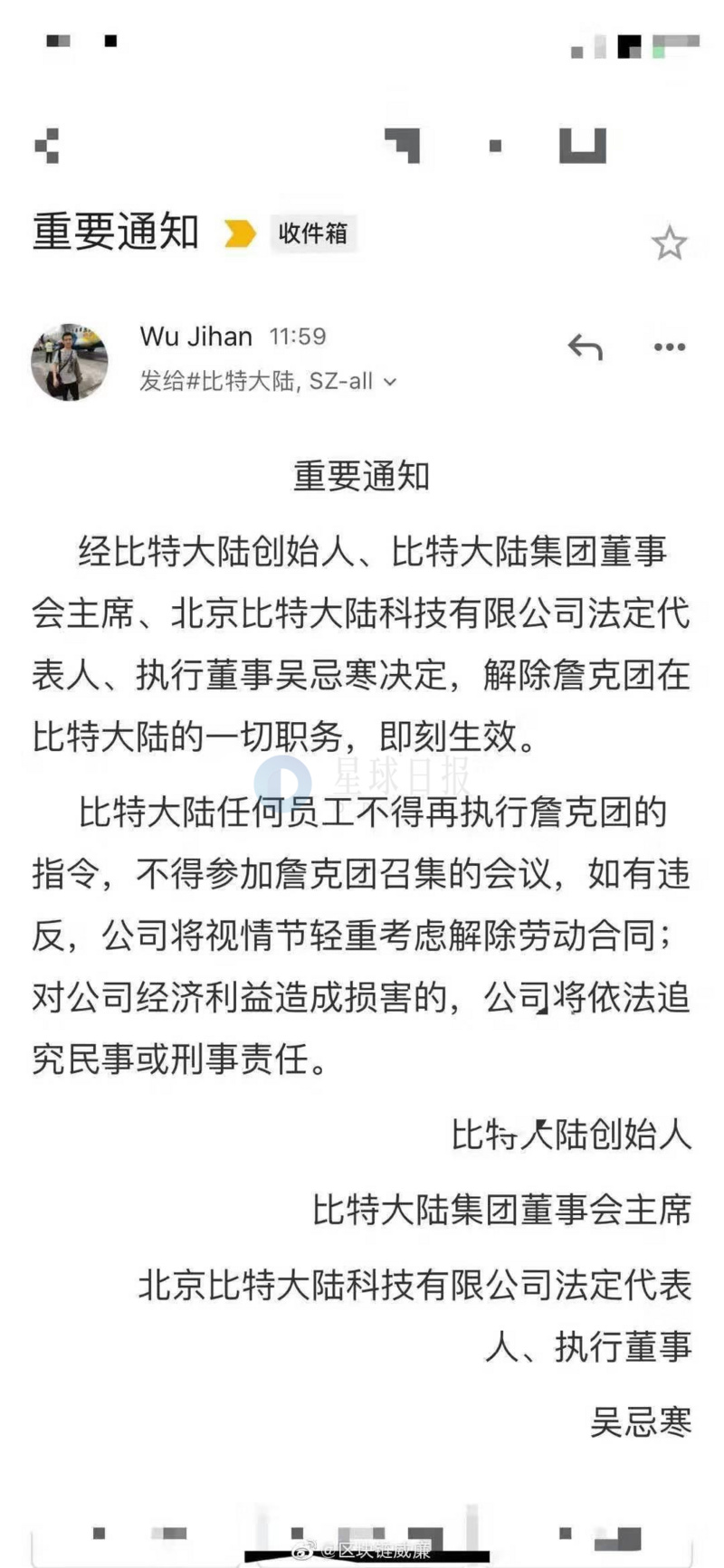 Odaily星球日报昨日独家获悉,吴忌寒发布的一封内部邮件显示,詹克团已被解除在比特大陆的一切职务,即刻生效。昨日上午,北京比特大陆科技有限公司发生了工商变更,法定代表人由詹克团变更为吴忌寒,此外吴忌寒还接替了执行董事一职。 消息已获比特大陆官方证实。