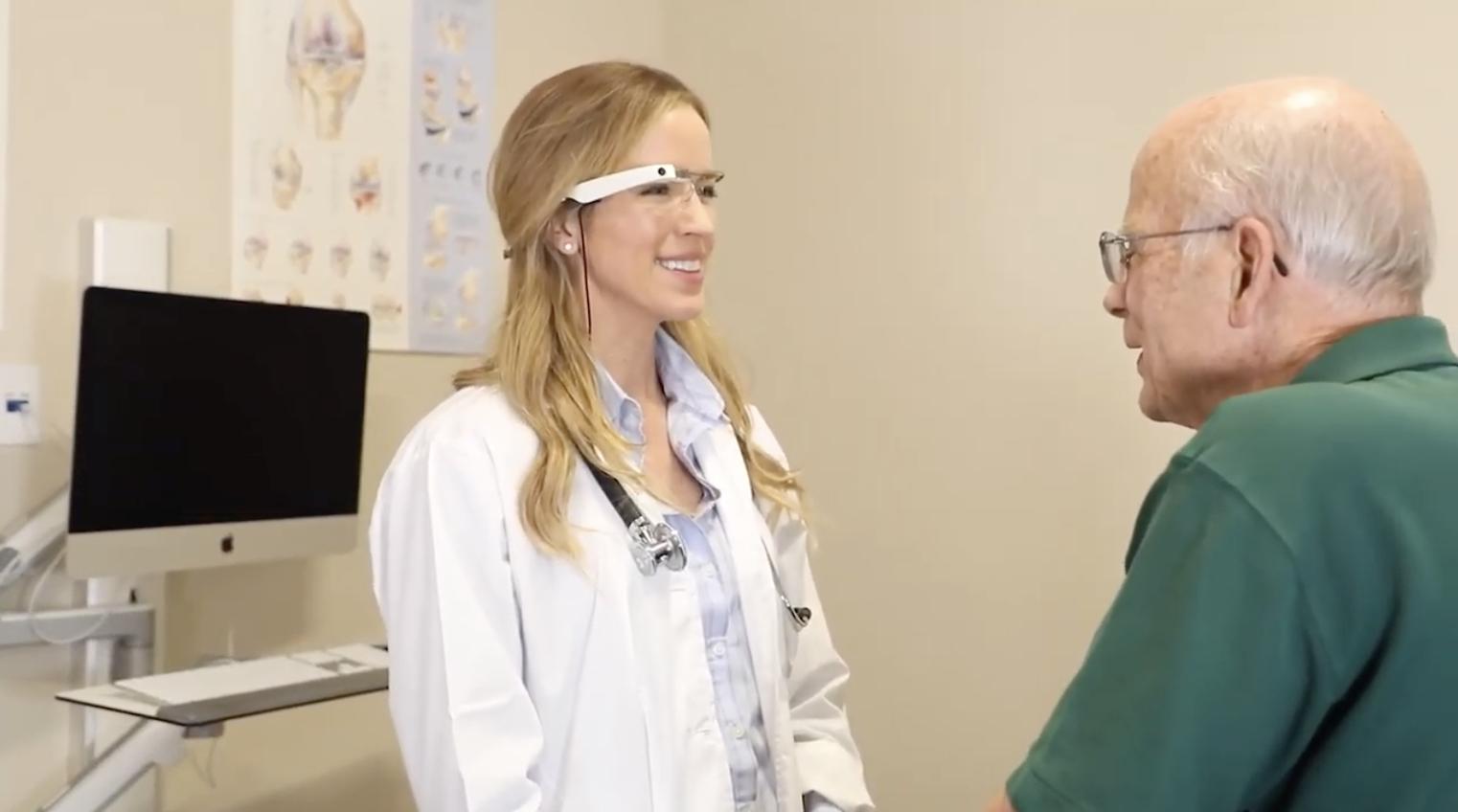 佩戴着谷歌眼镜的医生和患者对话