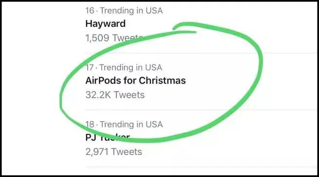 而“AirpodsforChristmas”更是成了推特上的热门话题,在推特榜单上排名第17。