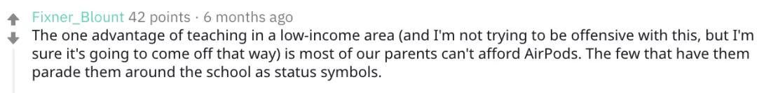 “在低收入地区教学的优势之一,就是大部分家长没钱给孩子买AirPods。少数能买得起AirPods的学生,把AirPods当成了地位的象征,在学校里游行炫耀。”
