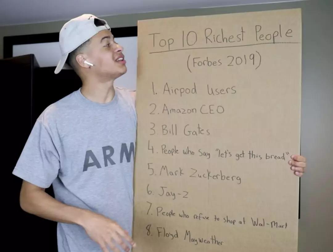 △就有主播戏谑地做了一个排行,AirPods用户被评为了福布斯2019世界首富,排名高于比尔·盖茨、扎克伯格以及不去沃尔玛购物的人们。