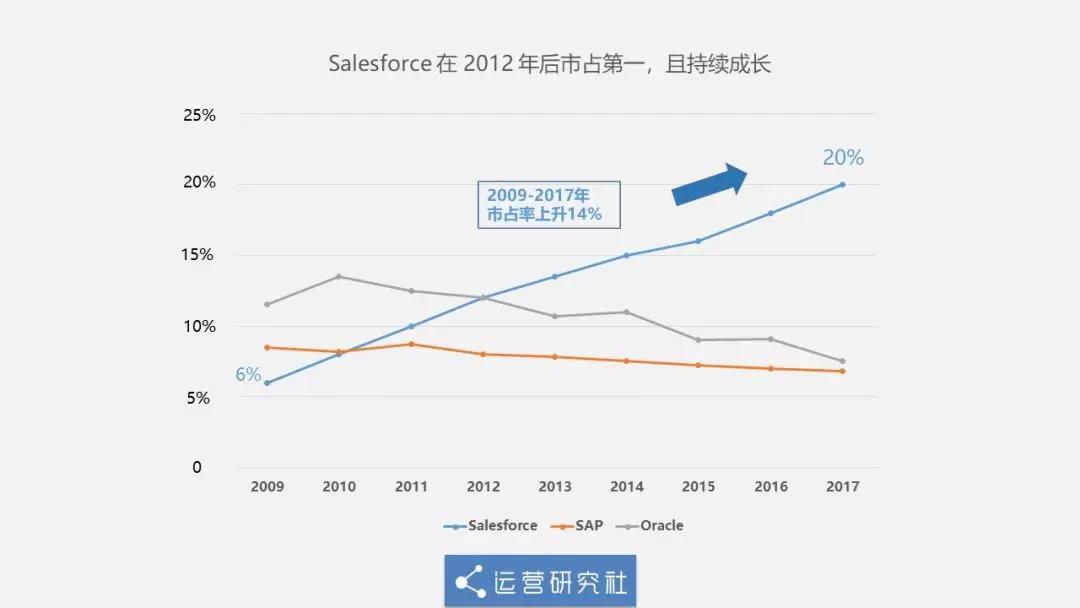 现在CRM系统的红利期已过,再做一个中国版Salesforce基本没啥机会了。相比于借鉴和复制产品形态,Salesforce从一个斗志昂扬的行业新星快速成长为行业领导者,它在这个过程中遵循的策略,还是值得研究和学习。