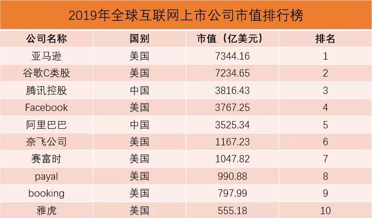 不久前,我无意中看到了一份《2019年全球互联网上市公司市值排行榜》,里面果然都是亚马逊、谷歌、腾讯、阿里这种互联网大佬级公司的名字。