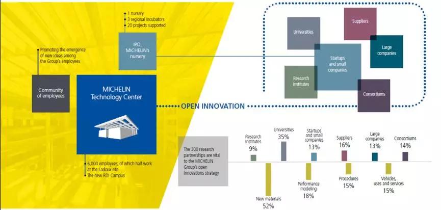 米其林很早就关注到“开放式创新”以及企业与外部创新系统的链接。在2014年,米其林成立米其林创新孵化中心(Incubation Program Office,IPO),驻点设立在法国总部克莱蒙费朗、美国格林威尔和中国上海,期望在公司的核心业务之外,探寻新的商业创见、新的商业模式、新的工作方式、以及推出创新产品的新的流程。其中,中国IPO尤为侧重新技术,例如IOT、大数据、人工智能等在创新业务、创新产品方面的应用。此基础上,米其林还制定了开放式创新战略,来拓展外部链接以更好的进入创新领域。