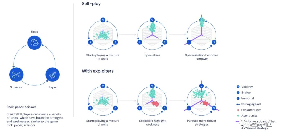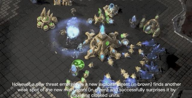 随着智能体联赛不断进行,新智能体的出生,就会出现新的反击策略(CounterStrategies),来应对早期的游戏策略。